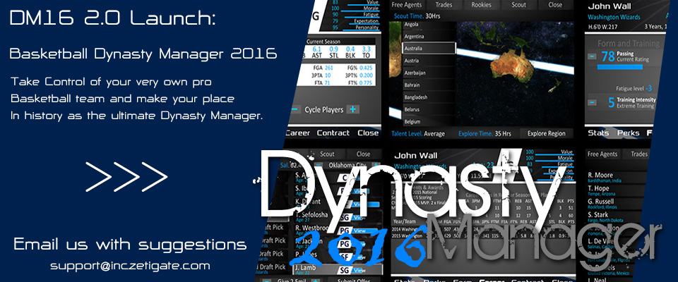 InczeTigate Development is happy to announce the release of its latest app, Basketball Dynasty Manager 2016 2.0 DM16 allows users to chose one of 30 teams or select a new city location to develop. Once selected Trade, Draft, Sign free agents and drop players to build your ultimate team. Keep the crowds coming in with star players, high scorers, great passers and amazing rebounders. Make upgrades to the stadium, transport or scouts and get benifits with each. Fight through the playoffs for the ultimate goal of winning a championship. All this and more! |
